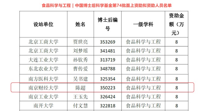 师资博士后陈超获得中国博士后科学基金面上资助,资助标准为8万元。